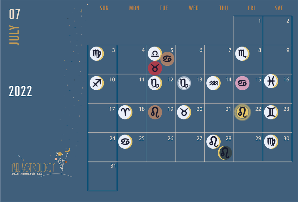 Astrology Calendar July 2022 Choose a month December 2021 January 2022 February 2022 March 2022 April 2022 May 2022 June 2022 July 2022 August 2022 September 2022 October 2022 November 2022 December 2022 Choose a month December 2021 January 2022 February 2022 March 2022 April 2022 May 2022 June 2022 July 2022 August 2022 September 2022 October 2022 November 2022 December 2022 Jul 2022 Detailed Events 03 – Moon enters Virgo05 – Moon enters Libra, Mercury enters Cancer, Mars enters Taurus08 – Moon enters Scorpio10 – Moon enters Sagittarius12 – Moon enters Capricorn13 – Full Moon in Capricorn14 – Moon enters Aquarius16 – Moon enters Pisces17 – Venus enters Cancer18 – Moon enters Aries19 – Mercury enters Leo20 – Moon enters Taurus22 – Sun enters Leo23 – Moon enters Gemini25 – Moon enters Cancer28 – Moon enters Leo, New Moon in Leo29 – Jupiter goes Retrograde30 – Moon enters Virgo Calendar Key The data in this calendar is based on USA EST Eastern Standard Time (UTC-05) timezone. Each event presented on a certain date, occurred between 12:00 AM to 11:59 PM EST on that date. Jun 2022 2022 Calendar Main Aug 2022 Schedule Your Personal Reading Learn Astrology Basics